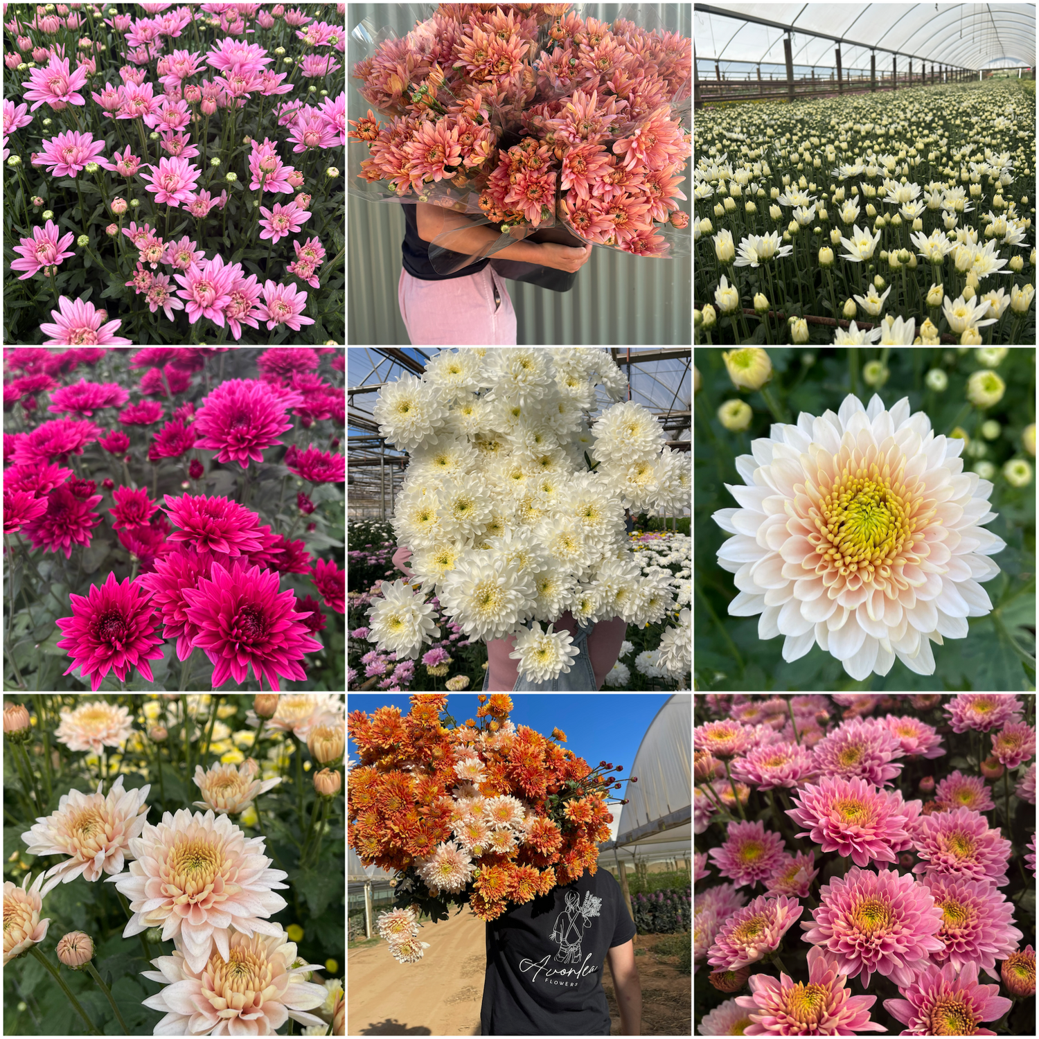 An old, and thus very varied flower, Chrysanthemums are extremely popular. Grown especially for the huge Mothers' Day trade, they come in whites, pinks, apricots, yellows & greens.