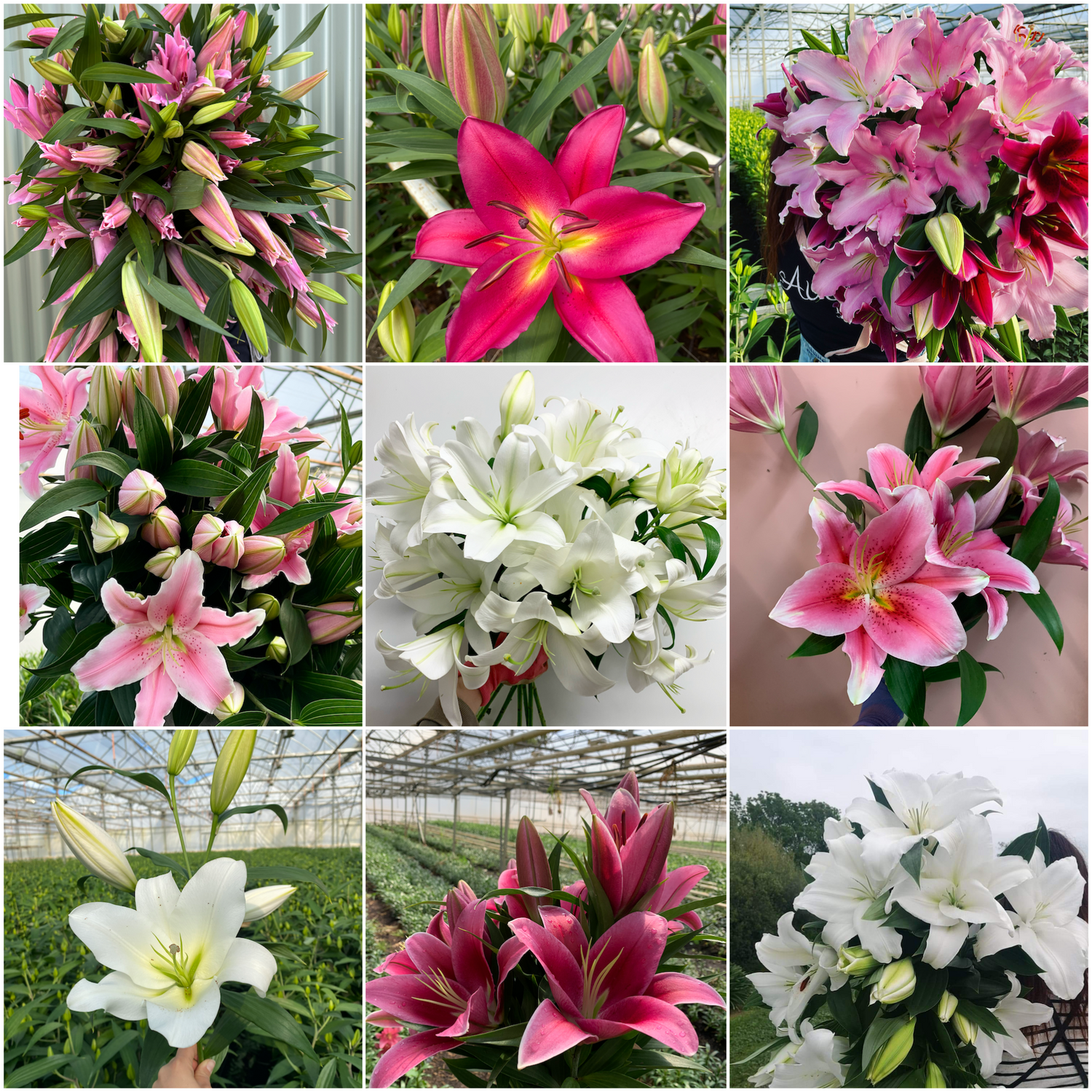 Our Oriental Lilies are hybrids of Lilium auratum andLilium speciosum. Their big flowers open up to be star-shaped, with a strong sweet scent and come in white & pink.