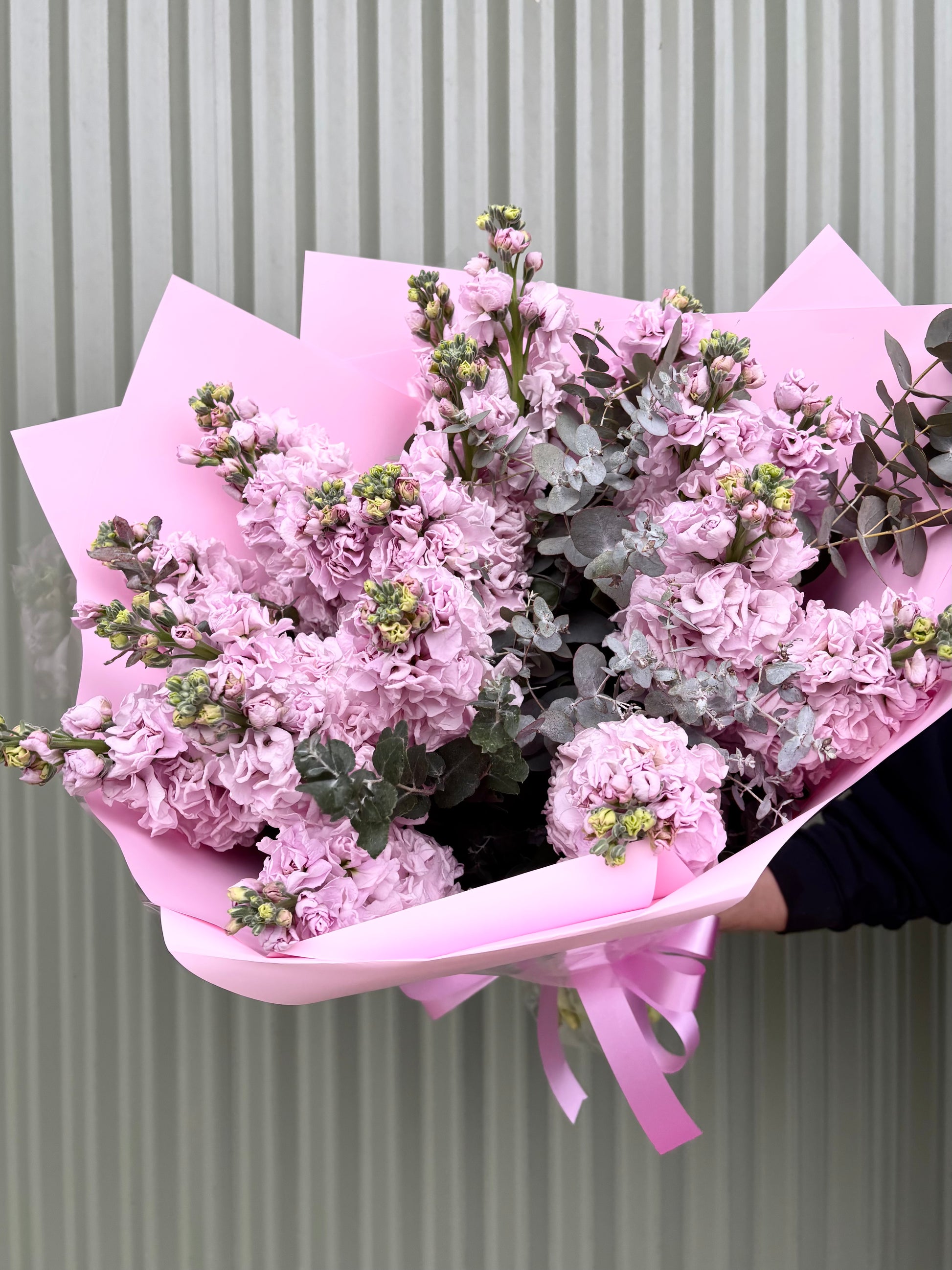 These beautiful, fragrant flowers come in pretty pastel pink or white & are mixed with our fresh blue gum. Shades of colors may differ from photos, based on available varieties.